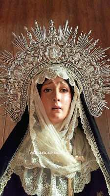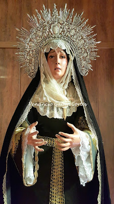 Hoy tras meses, le he mandado una fotos de buena calidad (las mismas que ilustran esta entrada) de su Virgen como le prometí. No solo le ha causado una gran alegría sino que al recibirlas me dice tras pedirle permiso para volver a escribir sobre él "Solo una cosa, felicita al vestidor y dile que las manos las hice así para que llevase la corona de espinas y los clavos, acuérdate de decirle lo que te he comentado al vestidor"