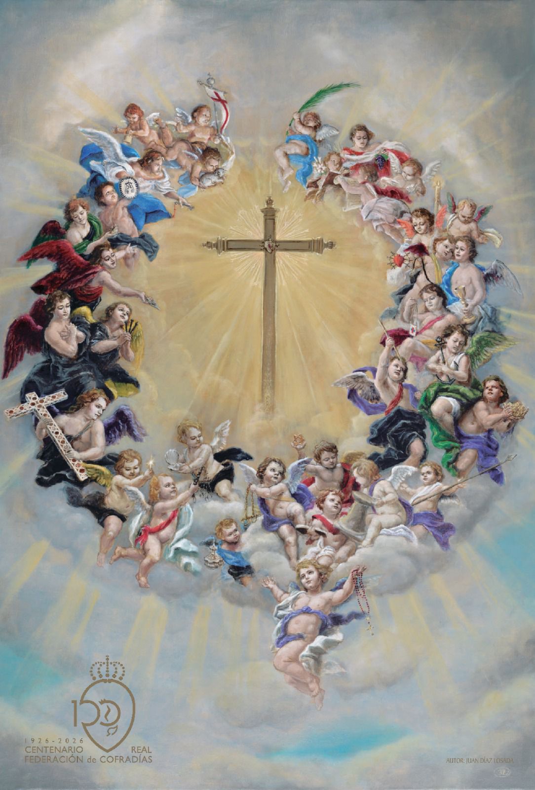 32 ángeles y arcángeles representan a cada una de las hermandades penitenciales que conforman nuestra Semana Santa, todos ellos alrededor de la imagen que preside la pintura, que es la señal del cristiano por antonomasia, la cruz. 32 más 1, que como bien ha explicado el presentador de la obra, «nuestra singular procesión del Domingo de Resurreción con el Dulce Nombre de Jesús, Los Facundillos; la cantera de la Semana Santa de Granada, también está presente aunque pertenezca a la hermandad del Señor de la Humildad».